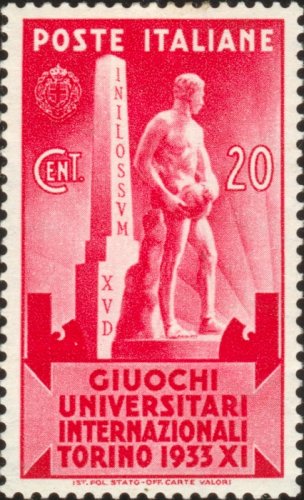 Arms of Savoy with fasces in upper left corner. Text "Giuochi universitari internazionali Torino 1933 XI (fascist era)" on an ancient plaquette. Shadow of fasces in the background.