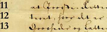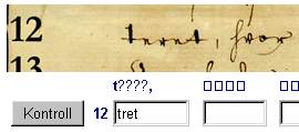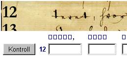 3. Skriv ditt forslag til avskrift i tekstboksene under firkantene. Når du vil sjekke din tolking mot originalen, trykker du på Kontroll-knappen til venstre.
